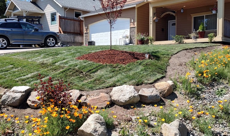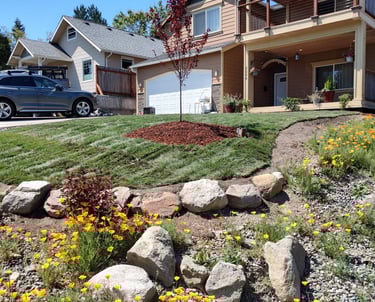 We restored this landscape by updating the yard to include new grass, flowers, rocks and to give it a refreshed new appeal.